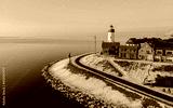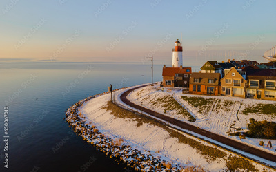 sunset at the Lighthouse of Urk Netherlands during winter with snow in the Netherlands.