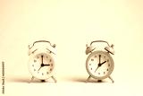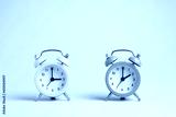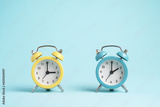 Two alarm clocks of blue and yellow colors, the hands show two o'clock and three o'clock. Concept of winter and summer time.