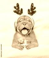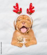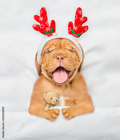 Cute Mastiff puppy dressed like santa claus reindeer Rudolf sleeps under white blanket at home and hugging toy bear. Top down view