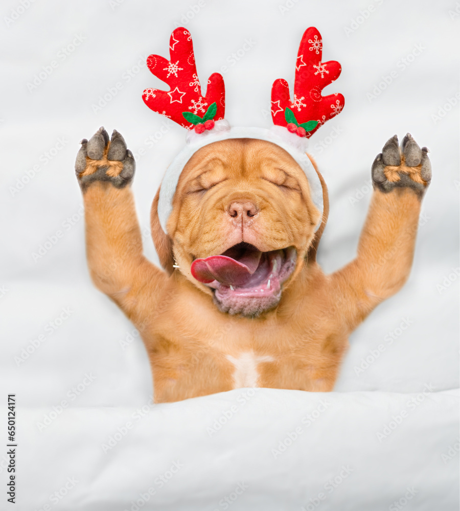 Yawning Mastiff puppy dressed like santa claus reindeer Rudolf lying under white blanket at home. Top down view