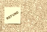 Yellow note paper with word refund on cork board background with copy space