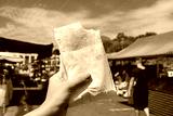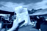 Pastel de Feira. Brazilian stuffed fried pastry against market fair in Sao Paulo, Brazil.