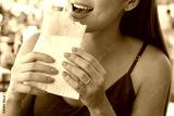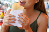 Happy young woman eating Pastel de feira a traditional Brazilian stuffed fried pastry