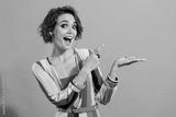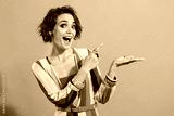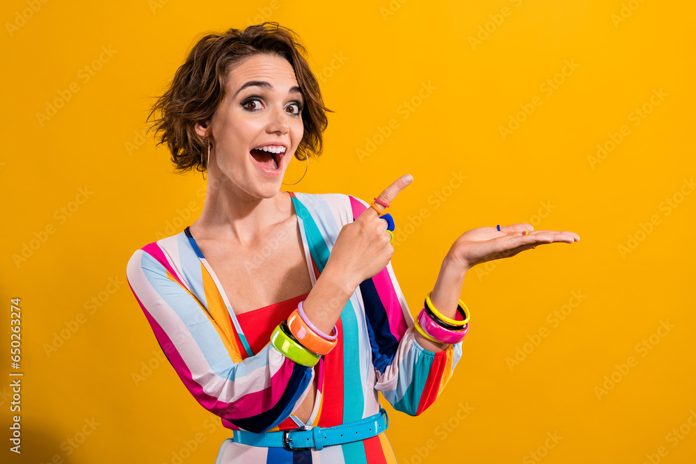 Photo of funny omg joking girl pointing finger palm demonstrating crazy offer indicating astonished isolated on yellow color background