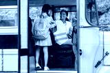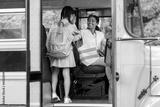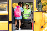 Transportation. Little Girl Giving High Five To Driver Woman While Entering Schoolbus