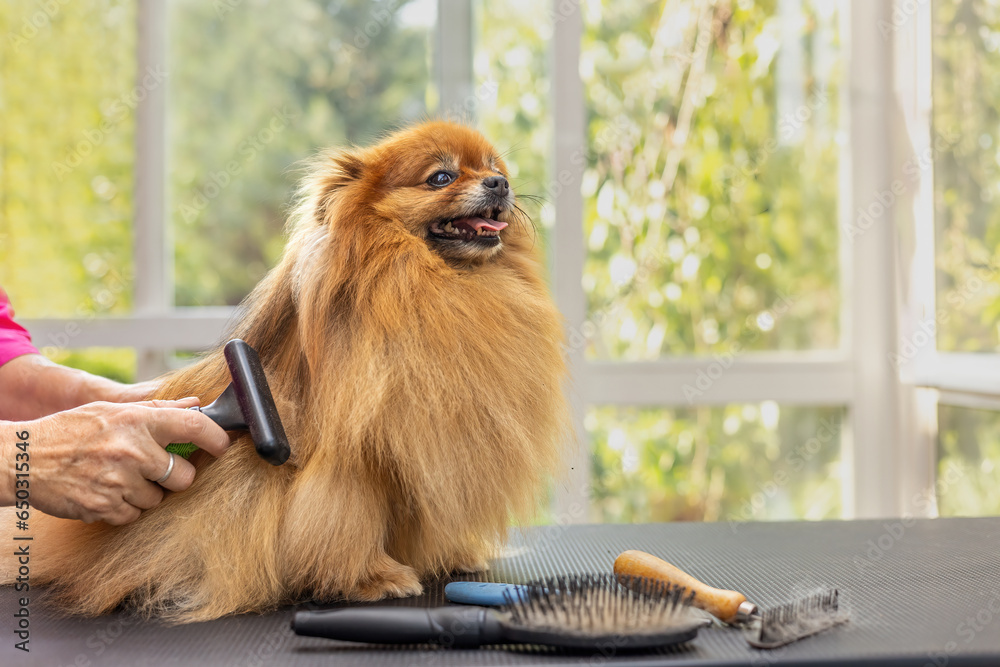 Side view of combed smiling Pomeranian dog standing on the table. Horizontally.