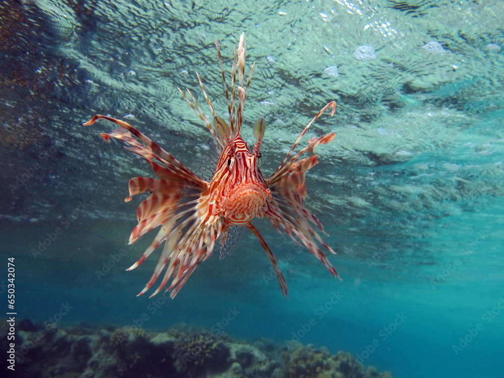 Lion Fish in the Red Sea in clear blue water hunting for food .