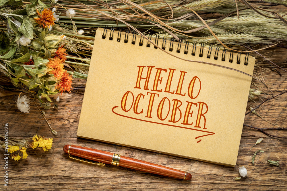 Hello October welcome note in a spiral notebook with floral bouquet of dry flowers and grain stalks, season and calendar concept