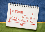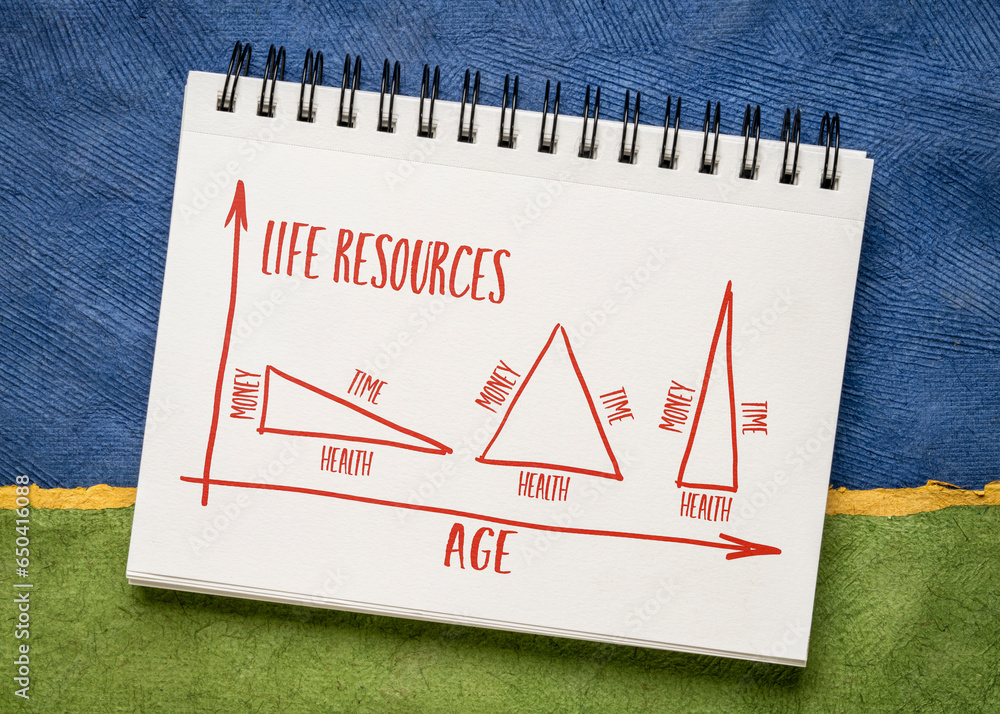 life resources, time, money and health, as a function of age, infographics sketch in a notebook, aging, lifestyle and finance concept