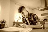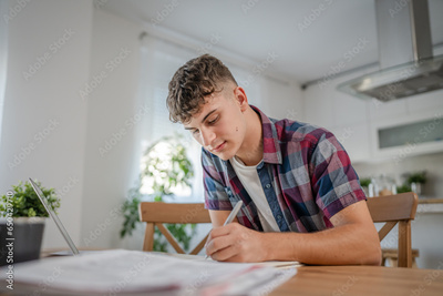 Young caucasian man teenager student study at home