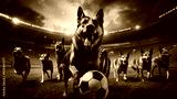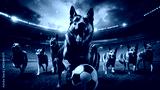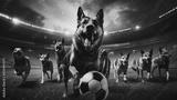 Group of dogs playing soccer in soccer stadium. Stadium full of people with flags. Dramatic lighting. Dark red color palette. Cinematic perspective. Soccer scenes. Front view.