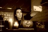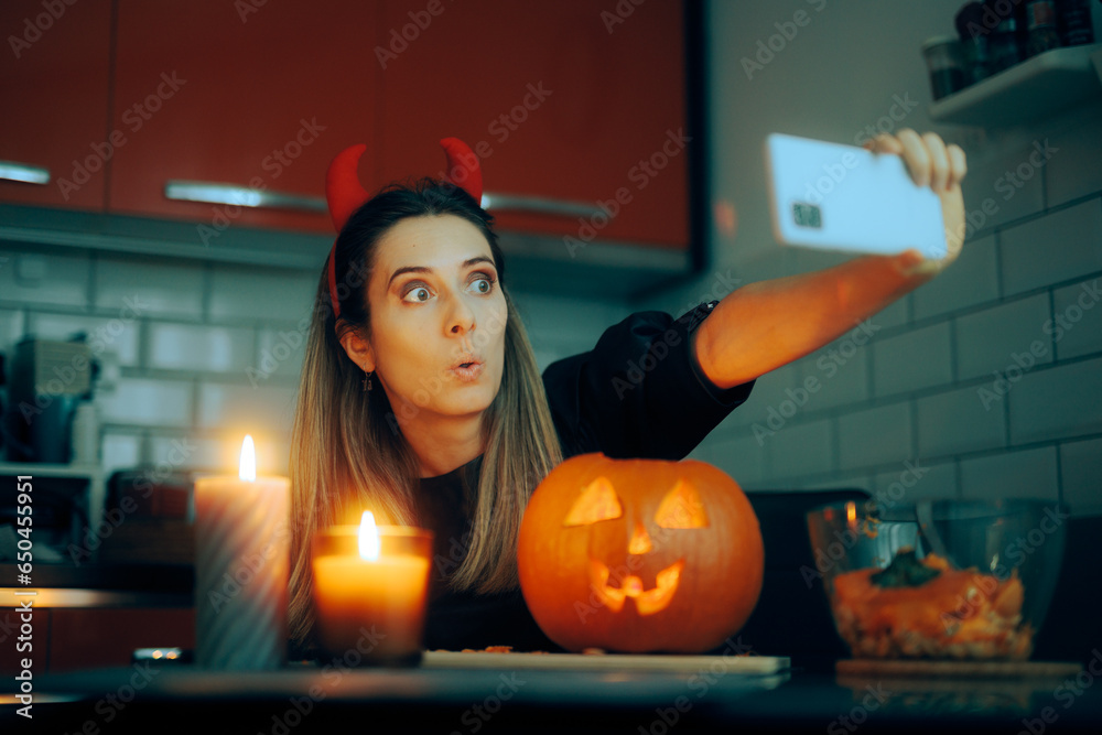 Funny Halloween Woman Taking a Selfie with a Jack-o-Lantern. Surprised cheerful girl photographing her holiday decorative pumpkin