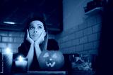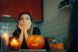 Sad Woman Feeling Alone During Halloween Celebration Events. Depressed bored girl waiting at home for holidays to pass