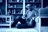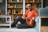 Happy handsome freelancer texting over smart phone while sitting by sofa on carpet in home office