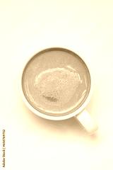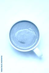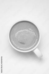 Cup of cappuccino coffee on a plain white table background. Cozy flatlay and top view. Coffee mug and breakfast routine. Minimalist concept