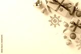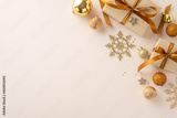 Wishing you Happy New Year! Top view of beautifully packaged gift boxes tied with satin bows, golden ornaments, glistening stars, snowflakes on pastel backdrop, offering area for your personal message