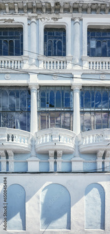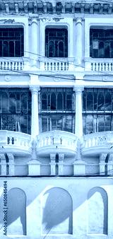 Street view of the facade of an old colonial building, Quito, Ecuador.