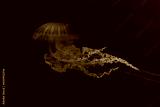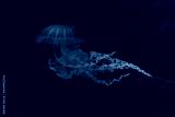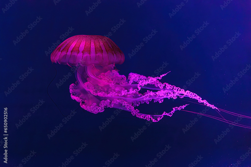 Fuorescent jellyfish swimming underwater aquarium pool with pink neon light. The South American sea nettle chrysaora plocamia in blue water, ocean. Theriology, tourism, diving, undersea life.