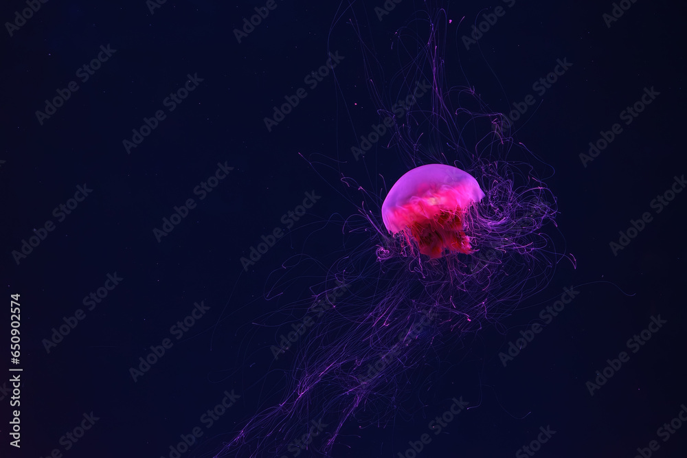 Fluorescent jellyfish swimming underwater aquarium pool with red neon light. The Lion's mane jellyfish, Cyanea capillata also known as giant jellyfish, arctic red jellyfish, hair jelly