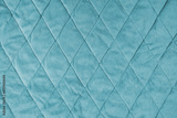 Quilted velours fabric background. Turquoise texture blanket or puffer jacket, stiched with diamond pattern, soft wrinkled surface, crupmed textile