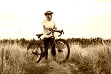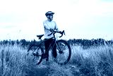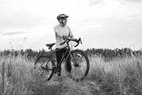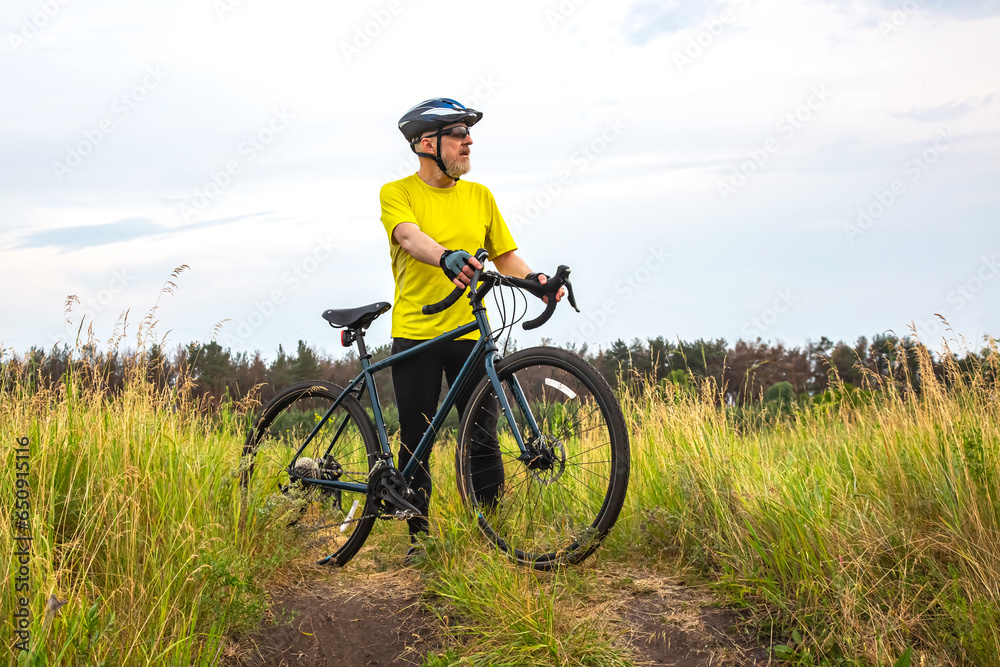 bearded man cyclist in yellow clothes is resting on a bicycle on the road in nature. sports, hobbies and entertainment for health