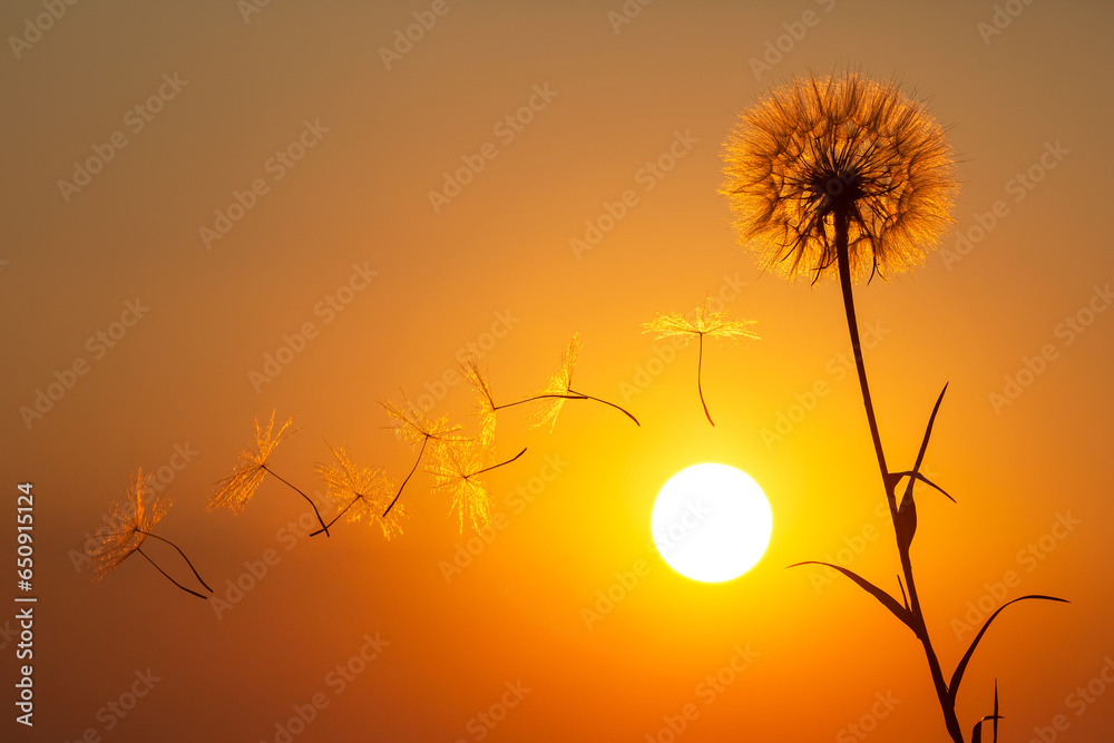 Dandelion seeds are flying against the background of the sunset sky. Floral botany of nature