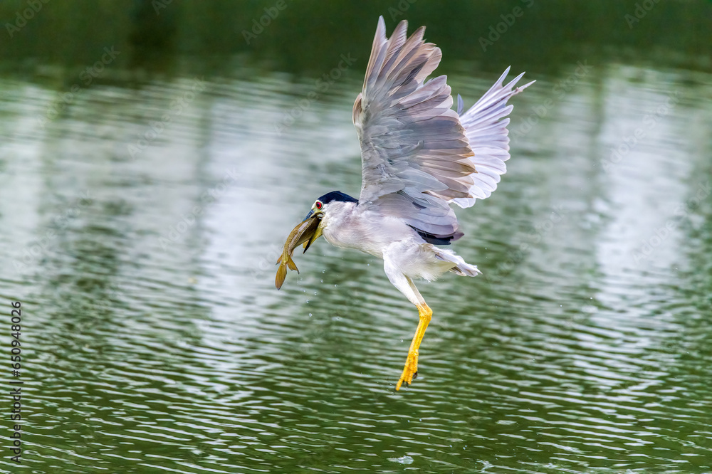 Night Heron fishing in river in shanghai city, China.