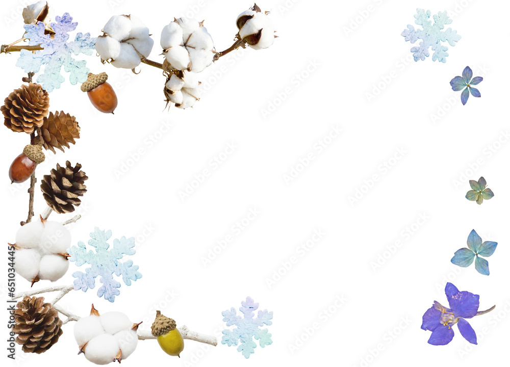 透過フレームー雪の結晶と実と押し花の冬イメージ