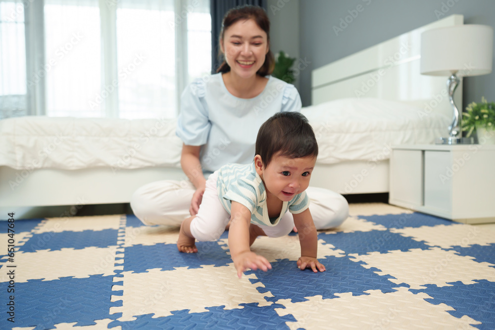 happy mother watching her infant baby crawlinf on play mat or jigsa floor in bedroom