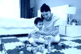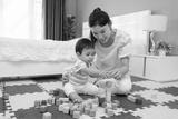 happy infant baby playing wooden block toy with mother on jigsaw mat in bedroom