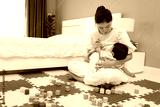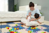 mother breastfeeding infant baby after playing wooden block in bedroom