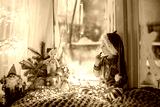 Cute toddler child in pajama, sitting on a fury blanket next to a window, looking outside at fireworks