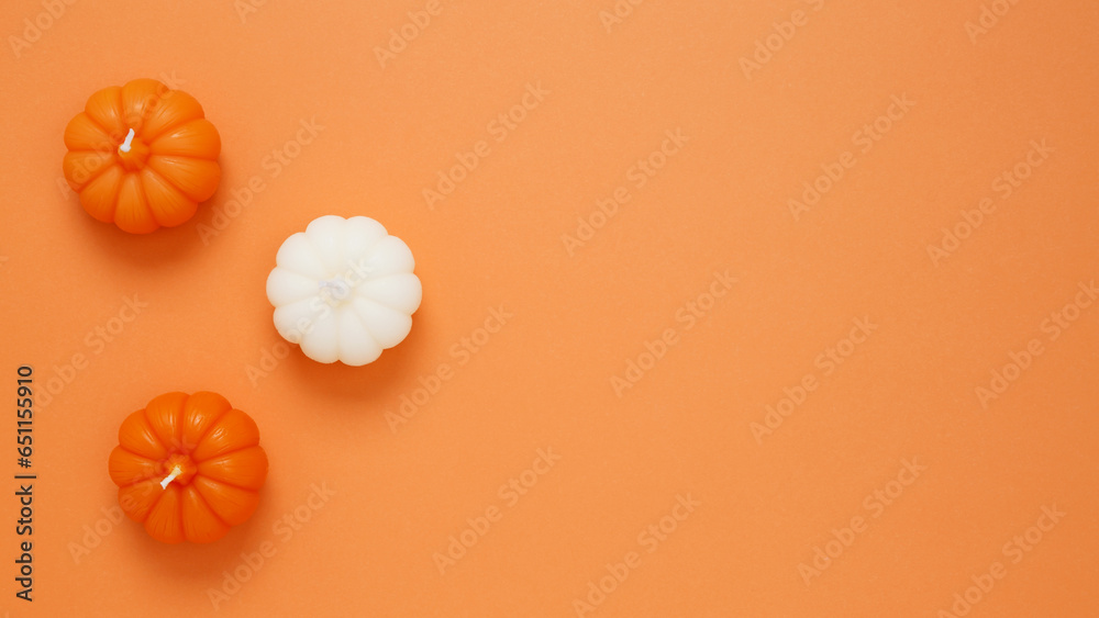 Halloween decorations with pumpkins on orange background. Happy halloween party. Flat lay, copy space, top view