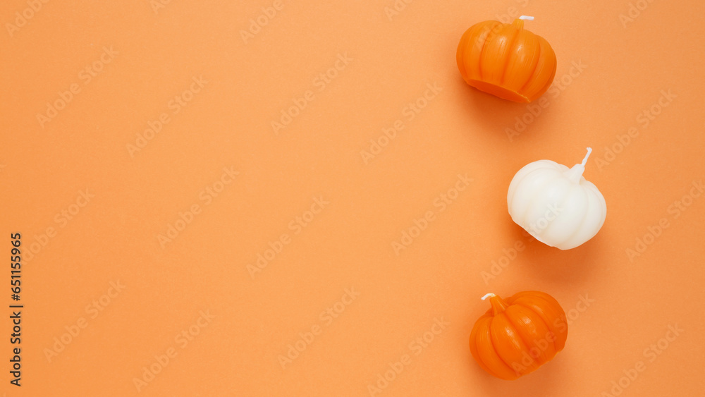 Halloween decorations with pumpkins on orange background. Happy halloween party. Flat lay, copy space, top view