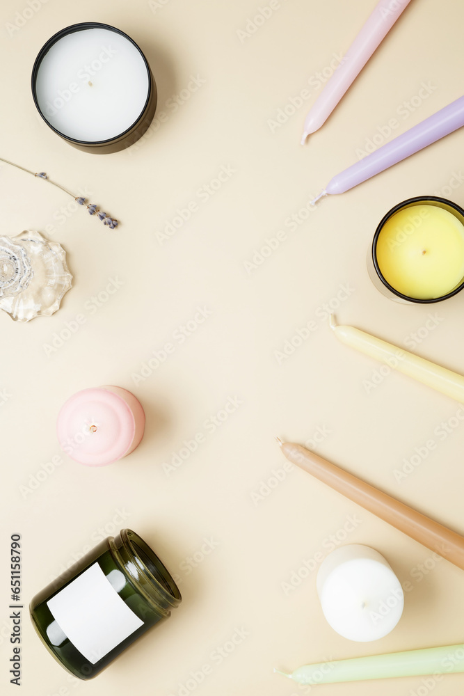 Set of various scented candles with branding mock up on a beige background. Top view, copy space, flat lay