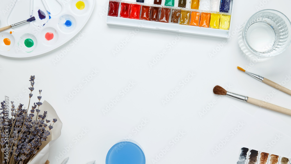 Watercolor and other artistic accessories on a white background. Artist's desk workplace. Top view, copy space, flatlay