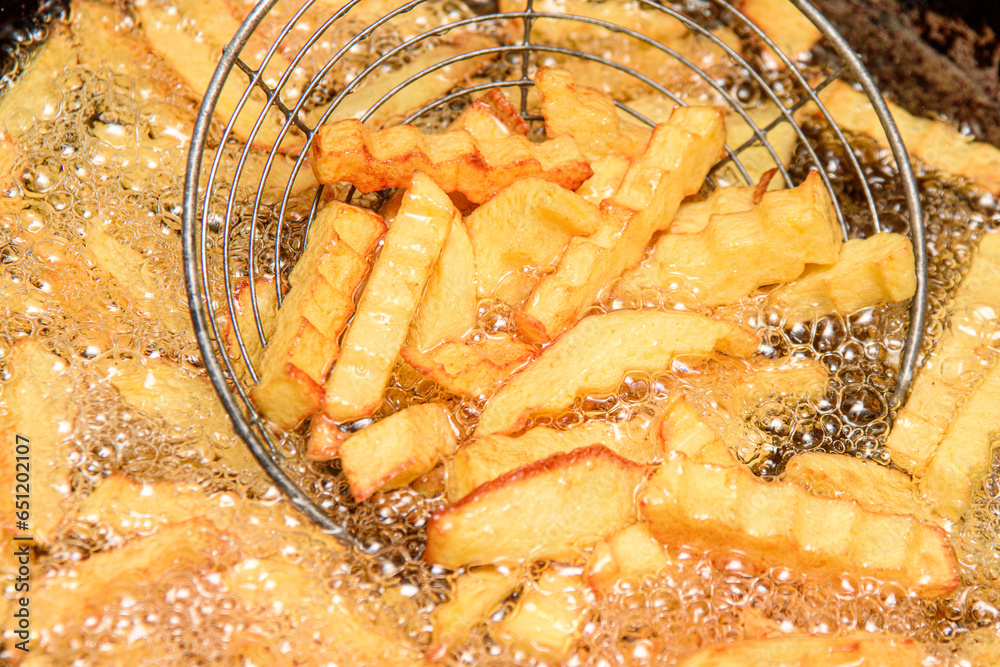 French fries cooking. Close-up of frying french fries in a deep fryer in hot oil