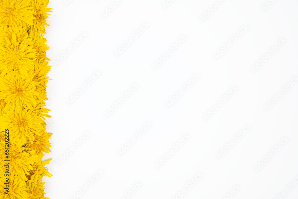 Yellow beautiful dandelions on the side on a sheet of paper. Layout for records from dandelions
