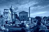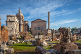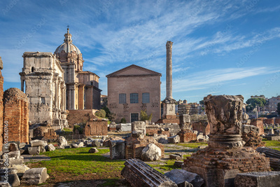 Roman ruins with Curia, Rostra and Triumphal Arch of Septimius Severus on the Roman Forum in Rome, Italy
