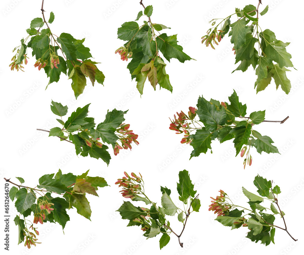 Many various branches of canadian maple tree with green leaves and red seeds on white background