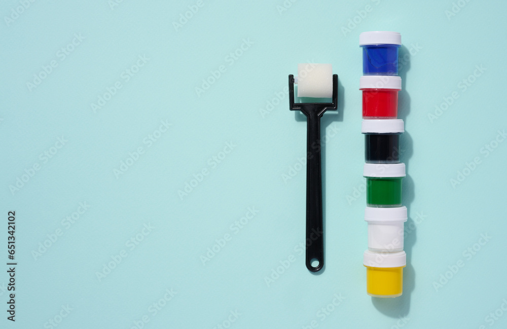 Plastic jars with multi-colored gouache on a blue background, copy space