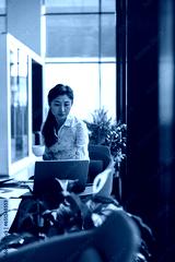 Focused stylish business woman working on laptop sitting the desk in office near window