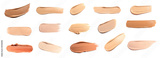 Foundation of different textures and shades for various skin types isolated on white. Set with samples of makeup product