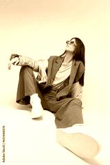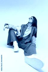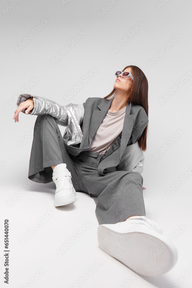 Fashion asian female model in silver down jacket and grey suit.