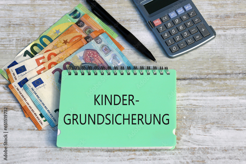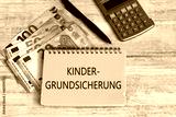 Kindergrundsicherung: Euro Banknoten, Notizblock,Taschenrechner und dem Text Kindergrundsicherung auf einem Notizblock.