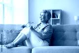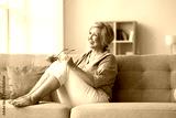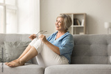 Happy satisfied old lady taking glasses off, looking away, smiling, laughing, resting on cozy home sofa. Elder senior patient enjoying good vision, strong eyesight after laser eye surgery
