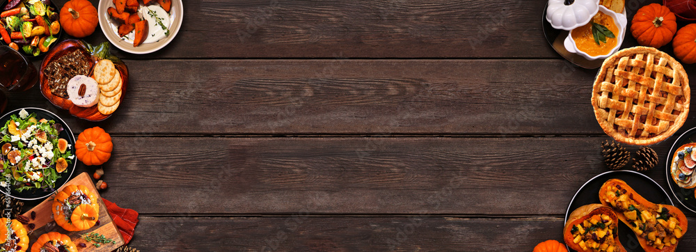 Delicious autumn meal double border. Overhead view on a dark wood banner background. Stuffed pumpkins and squash, sweet potatoes, appetizers, soup, vegetables and apple pie.
