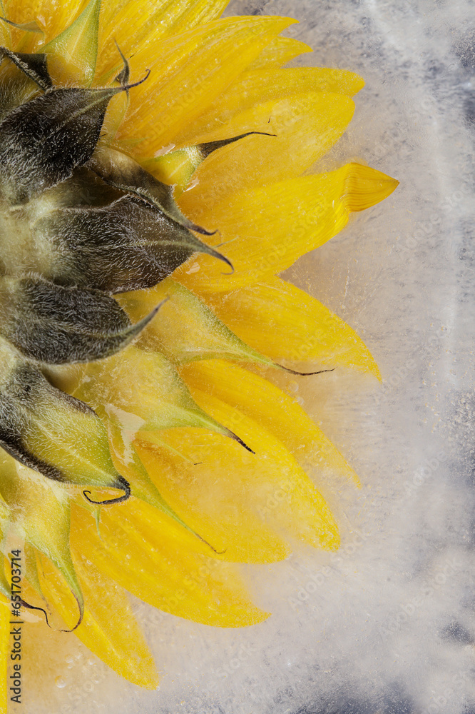 Sunflower frozen within a block of ice, air bubble texture