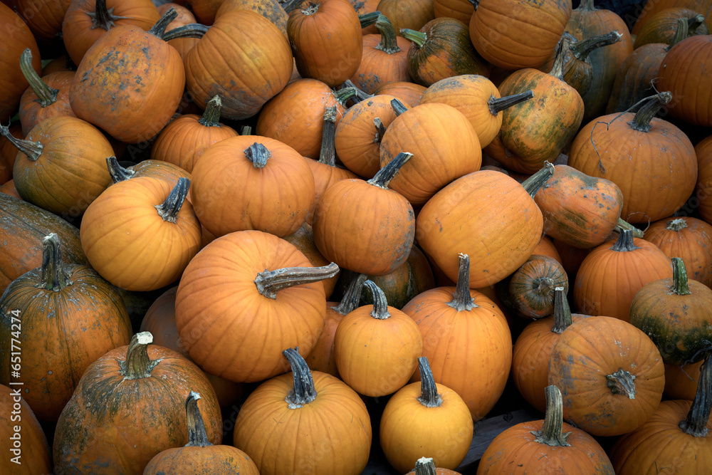 heap of pumpkins for halloween or thanksgiving, organic food harvesting many orange squashes background