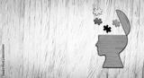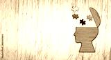 Mental health symbol. Human head silhouette with a puzzle cut out from wooden background